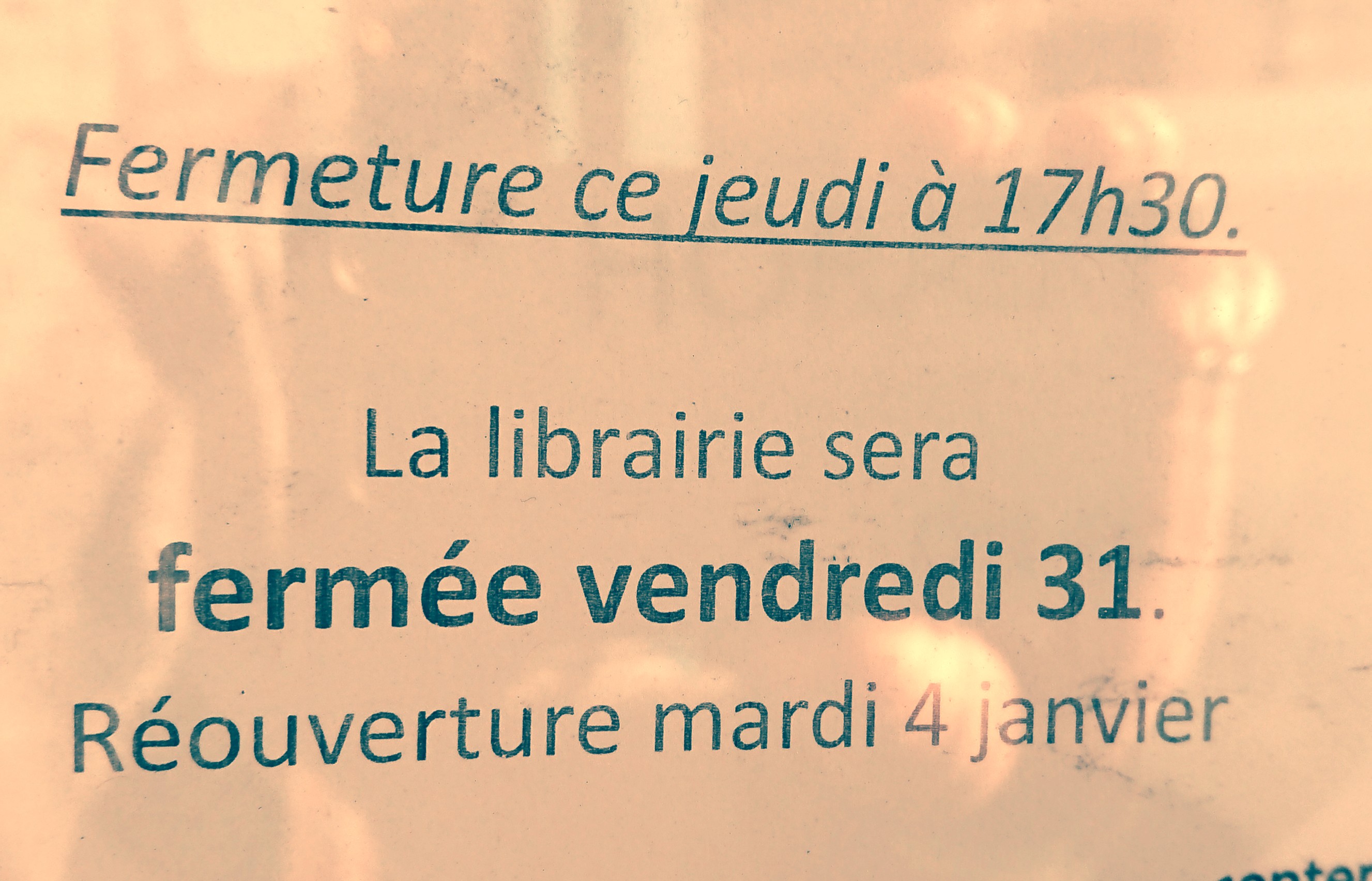 La librairie fermera le jeudi 30 à 17h30 pour quelques jours de repos. Réouverture mardi 4 janvier. Joyeuses fêtes de fin d’année ! 😊